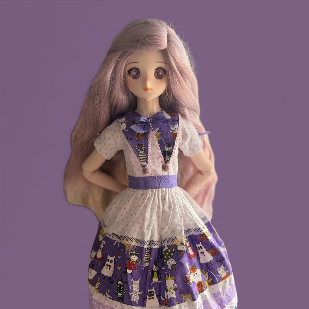 Add a touch of fairytale charm to your doll’s wardrobe with this handmade Lolita-inspired dress in shades of purple and white. The design features a delicate lace bodice, layered printed skirt with halloween patterns, and a satin-style ribbon waistband. Perfect for collectors who love detailed, feminine styles.